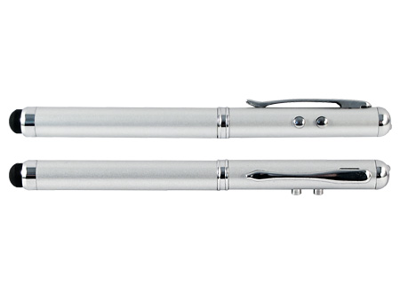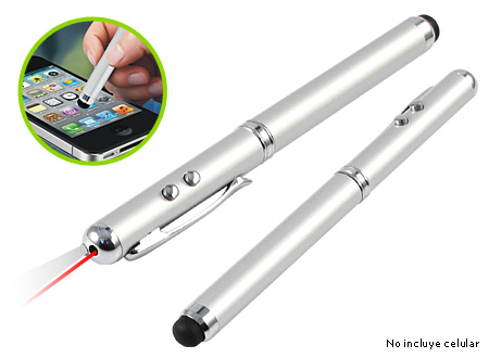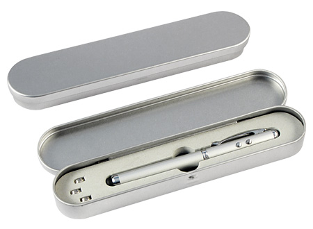 Bolígrafo metálico multi-función 4 en 1. Incluye bolígrafo, linterna LED, puntero láser y NUEVO puntero "Touch-Screen" para pantallas táctiles. Presentación en estuche de aluminio. Escritura Azul. FICHA DEL PRODUCTO Tamaño: Estuche 18 x 4 cm. Pilas: Usa 3 o 4 pilas tipo botón (incluidas). Escritura: Azul. Presentación: En estuche de aluminio.
